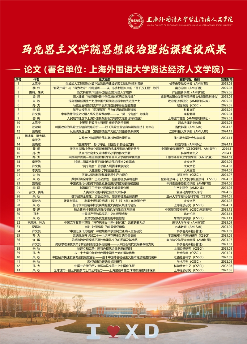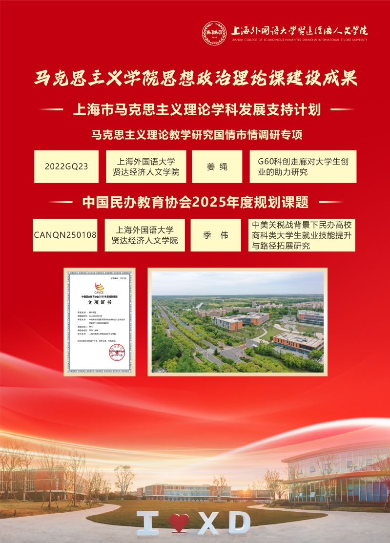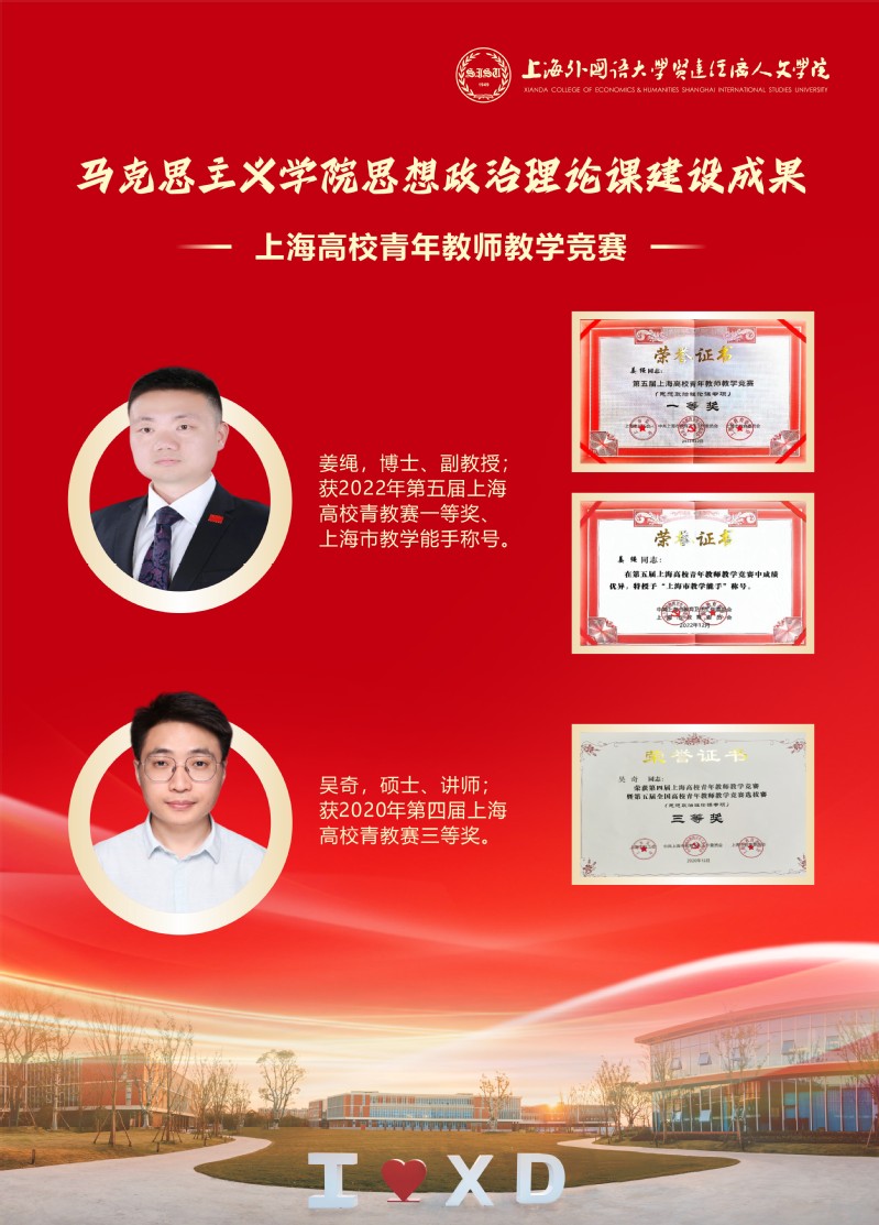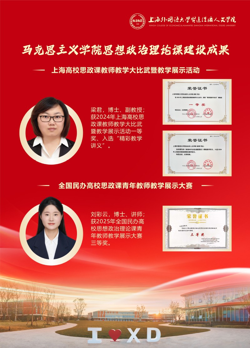 学校为首批上海高校马克思主义学院攻坚提质计划建设单位(2024--2026)。近年来,学院教师共获得上海市青年教师教学大赛一等奖1项、三等奖2项,上海高校思政课教师教学大比武暨教学展示活动一等奖1项,全国民办高校思政课青年教师教学展示大赛三等奖1项,第六届全国民办高校党的建设和思想政治工作优秀成果一等奖1项,上海民办高校党建与思政工作研究课题一等奖1项,全国民办高校思政课实践教学优秀典型案例二等奖1项;完成市级以上课题10余项;出版著作(教材)5部;公开发表论文50余篇。