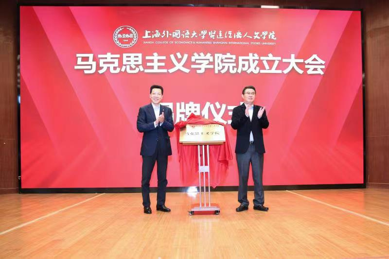 (上外贤达学院董事长鲍贤嗣与上海市教卫党委副书记、上海市教委副主任、上海市民办高校党工委书记闵辉共同为马克思主义学院成立揭牌)