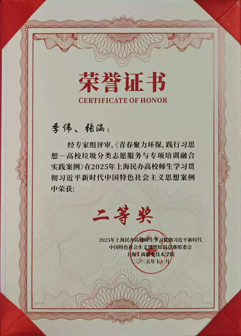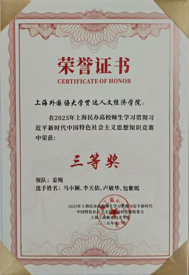 11月30日,由我院副教授姜绳带队,李天依、卢敏华两位青年教师,以及商学院法学专业马小颖、艺术与传媒学院广告学专业包紫嫣两位同学组成的代表队,经过预赛、复赛、决赛三个阶段的比拼,荣获2025年上海市民办高校师生学习贯彻习近平新时代中国特色社会主义思想知识竞赛三等奖。另外,由我院讲师季伟博士、艺术与传媒学院广告学专业张涵同学撰写的《青春聚力环保,践行习思想——高校垃圾分类志愿服务与专项培训融合实践案例》,荣获2025年上海民办高校师生学习贯彻习近平新时代中国特色社会主义思想案例二等奖。